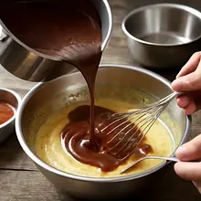 Do ubitych jaj zacznij powoli wlewać łyżką gorącą mieszankę mleka i kakao, cały czas energicznie mieszając trzepaczką (temperowanie). Wlewaj partiami przez 2-3 minuty, aż wlejemy około połowy płynu i masa zacznie się wyrównywać. Następnie przelej całą masę z powrotem do rondla i podgrzewaj na niskim ogniu, mieszając drewnianą łyżką, aż masa zgęstnieje na tyle, że przy przeciągnięciu łyżki po dnie zostanie ślad (to trwa zwykle 5-8 minut). Nie dopuszczaj do wrzenia - jeśli pojawią się pęcherzyki, natychmiast zmniejsz ogień.