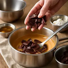 W rondlu na średnim ogniu podgrzej mleko (300 ml) i 200 ml śmietanki (odstawionej z całej ilości) razem z kakao (30 g). Mieszaj trzepaczką, aby kakao rozpadło się i nie tworzyły się grudki. Podgrzewaj do momentu, gdy para zacznie się wydobywać, a masa będzie gorąca, ale nie dopuszczaj do wrzenia (ok. 80°C — masa ma lekko parować).