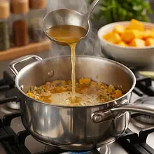Zmniejsz ogień do średnio-niskiego. Wlej pierwszą chochlę gorącego bulionu, tak aby przykryła ryż. Mieszaj powoli i niemal bez przerwy, aż ryż wchłonie cały płyn. Następnie dodaj kolejną chochlę bulionu i powtarzaj proces. Kontynuuj dodawanie bulionu, chochla po chochli, i mieszanie przez około 15-18 minut. Risotto jest gotowe, gdy ziarna są miękkie, ale wciąż lekko twarde w środku (al dente), a całość ma konsystencję gęstej, płynnej owsianki.