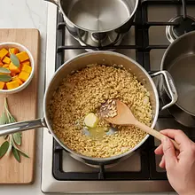 Po około 10 minutach gotowania, gdy zużyjesz mniej więcej połowę bulionu, dodaj do ryżu przygotowane wcześniej purée z dyni. Dokładnie wymieszaj, aby połączyło się z ryżem. Kontynuuj dodawanie bulionu, chochelka po chochelce, cały czas mieszając, przez kolejne 8-10 minut.