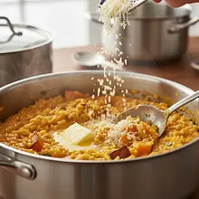 Po około 18-20 minutach całkowitego czasu gotowania, spróbuj ryżu. Powinien być miękki na zewnątrz, ale stawiać lekki opór pod zębem w środku (al dente). Konsystencja całego dania powinna być płynna i kremowa, 'spływająca' z łyżki, a nie zbita i gęsta. Jeśli ryż jest wciąż twardy, dodaj jeszcze trochę bulionu i gotuj dalej, próbując co minutę.