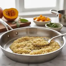Po około 15 minutach spróbuj ziarenko ryżu. Powinno być już prawie miękkie, ale wciąż stawiać lekki opór pod zębem (al dente). Wyjmij upieczoną dynię z piekarnika. Około 3/4 dyni dodaj do risotto i delikatnie wymieszaj. Pozostałą 1/4 zachowaj do dekoracji. Gotuj jeszcze przez 2-3 minuty, dodając ostatnią chochlę bulionu, jeśli risotto jest zbyt gęste.