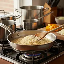 Zwiększ ogień i wsyp na patelnię suchy ryż Arborio. Energicznie mieszaj drewnianą łyżką przez około 1-2 minuty. To kluczowy etap zwany 'tostatura'. Każde ziarenko ryżu powinno pokryć się tłuszczem i stać się lekko przezroczyste na brzegach, z białym, matowym środkiem (tzw. 'perłą'). Ten proces 'zamyka' ziarna, dzięki czemu ryż ugotuje się równomiernie i pozostanie al dente w środku.