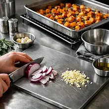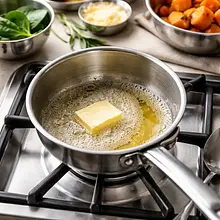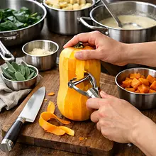 Nagrzej piekarnik do 200°C (góra-dół, bez termoobiegu). Obierz dynię: połóż ją stabilnie na desce i odetnij oba końce. Przekrój na pół wzdłuż, wydrąż pestki łyżką i pokrój miąższ w kostkę o boku około 2 cm. W dużej misce wymieszaj pokrojoną dynię z 15 g oliwy z oliwek, 1 g soli (około 1/3 łyżeczki), 1 g świeżo mielonego pieprzu i odrobiną gałki muszkatołowej. Rozłóż równomiernie na blasze wyłożonej papierem do pieczenia.
