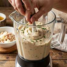 Kremowy dip z fasoli to gęsta, aksamitna pasta idealna jako przekąska na spotkania, do kanapek lub jako dodatek do świeżych warzyw. Inspiracja polską kuchnią – proste składniki z puszki fasoli wzbogacone wędzoną papryką, kminem rzymskim i dużą porcją szczypiorku tworzą nieoczywiste, lekko dymne i ziołowe nuty. Dzięki oliście konsystencji dip dobrze komponuje się z razowym pieczywem, chrupkimi krakersami z żyta lub młodymi warzywami sezonowymi (marchewka, ogórek, rzodkiewka). Jest wegetariański, łatwy do przygotowania w 20 minut i można go łatwo zmodyfikować na wersję bardziej kremową z dodatkiem jogurtu. Estetycznie podany – udekorowany szczypiorkiem i oliwą – stanowi rustykalny element stołu.