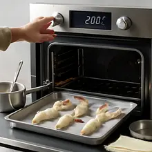 Użyj termoobiegu jeśli masz, ale skróć temperaturę o 20°C, jeśli piekarnik nie jest równomierny. Kontroluj kolor przez szybkę — złocisty kolor filo i różowy miąższ krewetki to wskaźnik gotowości. Nie piecz dłużej niż 12-14 minut — krewetki zrobią się gumowate.