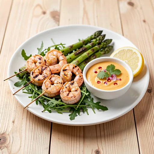 Delikatne krewetki grillowane na szpadkach, podane z aromatycznym sosem z mango, czerwonej cebuli i chili. To nowoczesne, lekkie danie łączy słodycz dojrzałego mango z kwasowością cytryny i pikantnym akcentem papryczki — doskonałe jako główny punkt letniego obiadu lub eleganckiej kolacji. W wersji polskiej proponuję dodać sezonowe szparagi i rukolę dla świeżości oraz opcjonalnie pęczak jako sycący dodatek. Danie jest efektowne wizualnie (intensywny kolor sosu, różowe krewetki, zielone szparagi) i szybko się przygotowuje, a sos mango można zrobić wcześniej, co ułatwia serwowanie przy gościach.