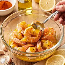 W dużej misce połącz olej rzepakowy, przeciśnięty przez praskę czosnek, paprykę słodką, sól, pieprz i sok z połówki cytryny (użyj około 30 g soku). Wymieszaj widelcem lub trzepaczką aż przyprawy rozprowadzą się równomiernie. Włóż krewetki do marynaty i dokładnie obtocz każde sztuki - użyj łyżki lub rękawiczek kuchennych. Odstaw na 10–15 minut w chłodne miejsce (nie dłużej, aby mięso nie straciło jędrności).