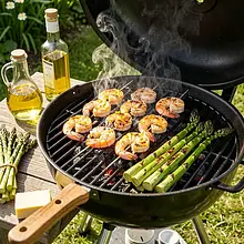 Rozgrzej grill do średnio-wysokiej temperatury (ok. 200°C) lub rozpal grilla węglowego do równomiernego żaru. Połóż szpadki z krewetkami i grilluj 2–3 minuty z każdej strony — kiedy krewetka zmieni kolor na różowy i przestanie być przeźroczysta, jest gotowa. Szparagi kładź obok lub w koszyku grillowym i grilluj 3–4 minuty, często przekręcając, aż pojawią się ciemne pręgi i będą jędrno-miękkie.