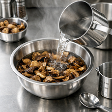 Namaczanie borowików: umieść 30 g suszonego borowika w misce i zalej 300 ml gorącej (nie wrzącej) wody. Odstaw na 20-30 minut, aż grzyby staną się miękkie. Po namoczeniu wyjmij grzyby na deskę i drobno posiekaj. Zachowaj wodę z moczenia (przecedź przez sitko z gazą lub filtr), będzie bazą do sosu.