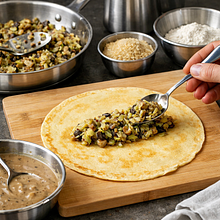 Doprawianie i studzenie farszu: zdejmij patelnię z ognia, do farszu dodaj 20 g masła dla głębi smaku. Dokładnie wymieszaj i przełóż farsz do szerokiego naczynia, rozprowadź równomiernie, aby szybciej ostygł. Farsz powinien mieć temperaturę zbliżoną do pokojowej przed pakowaniem do naleśników; gorący farsz rozmiękczy naleśniki i spowoduje pęknięcie panierki.
