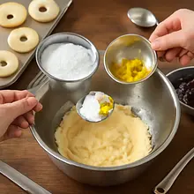Do dużej miski przesiej mąkę (300 g) razem z proszkiem do pieczenia (5 g) i solą (1 g). Przesiewanie napowietrzy mąkę i usunie ewentualne grudki. Wymieszaj suche składniki drewnianą łyżką.