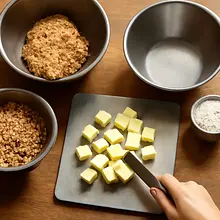 Przygotuj masło: pokrój zimne masło na małe kawałki (kostki ok. 1-2 cm) — ułatwi to ubijanie. Umieść pokrojone masło i cukier puder w dużej misce. Użyj miksera ręcznego z końcówkami do ubijania lub miksera stojącego z łopatką. Ubijaj na średniej prędkości 2-3 minuty, aż masa stanie się jasna, puszysta i kremowa (powinna być wyraźnie jaśniejsza niż surowe masło i lekko zwiększyć objętość).