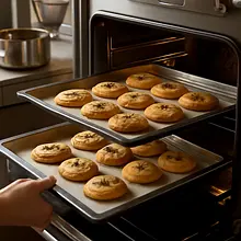 Wstaw blachy do nagrzanego piekarnika i piecz ciasteczka 10-12 minut. Ciasteczka są gotowe, gdy brzegi lekko się zezłocą, a środek pozostanie jasny (nadmierne zbrązowienie oznacza przesuszenie). Po upieczeniu zostaw ciasteczka 4-5 minut na blasze, aby stężały, a następnie ostrożnie przełóż je szpatułką na kratkę do całkowitego ostudzenia.