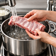 Umyj żeberko pod zimną wodą i włóż do dużego garnka o pojemności co najmniej 4 l. Zalej 2 litrami zimnej wody (woda powinna całkowicie przykrywać mięso). Zostaw mięso w zimnej wodzie na 5 minut, aby wypłukać resztki krwi, potem odlej wodę, opłucz ponownie i wlej świeże 2000 ml wody.
