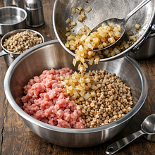 W dużej misce połącz: mięso wieprzowe mielone 300 g, ugotowaną kaszę gryczaną, podsmażoną cebulę z czosnkiem, jajko 60 g, posiekaną natkę pietruszki 10 g, sól (ok. 1 g), pieprz czarny 1 g i majeranek 2 g. Mieszaj ręką lub łyżką, aż składniki się połączą. Jeśli masa jest zbyt luźna, dodaj stopniowo bułkę tartą (max 50 g) aż do uzyskania formowalnej konsystencji.