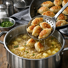 Przełóż zrumienione kulki do garnka z bulionem (gdy kasza i ziemniaki są już prawie miękkie). Gotuj w bulionie 10–12 minut na małym ogniu, aby dokończyły się w środku – sprawdź jedną kulkę: przekrój; środek powinien być gorący i soczysty, soki klarowne.