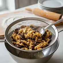 Zacznij od przygotowania grzybów. Umieść 50g suszonych grzybów w małej misce i zalej je około 400 ml wrzącej wody. Przykryj miskę talerzykiem i odstaw na co najmniej 30 minut, aby grzyby napęczniały i zmiękły. Po tym czasie odcedź grzyby przez gęste sitko, ale ABSOLUTNIE nie wylewaj wody – to esencjonalny wywar grzybowy! Grzyby drobno posiekaj ostrym nożem na desce.