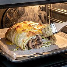 Użyj pędzelka silikonowego do posmarowania jajkiem. Pieczenie kończy się, gdy skórka jest chrupiąca i brązowa — można też sprawdzić temperaturę środka (ok. 90°C) lub naciąć i zobaczyć, że farsz jest gorący.