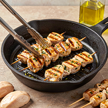 Podawaj gorące, prosto z grilla. Dla kontrastu podaj grillowane szparagi i sałatkę z młodej natki pietruszki z oliwą i cytryną. Możesz też podać jasny sos jogurtowy z ogórkiem i koperkiem. Upewnij się, że goście otrzymują ciepłe patyczki — serwuj od razu.