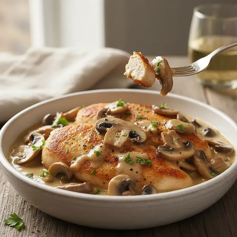 Zdejmij patelnię z ognia. Spróbuj sosu i w razie potrzeby dopraw go jeszcze solą lub pieprzem. Danie jest gotowe do podania. Wyłóż na talerze porcje kurczaka, obficie polej go sosem grzybowym. Opcjonalnie, dla dodania świeżości i koloru, posyp każdą porcję posiekaną natką pietruszki. Podawaj natychmiast, póki jest gorące.
