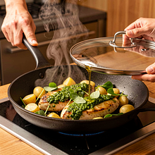 Rozgrzej dużą patelnię (najlepiej 26–28 cm) na średnio-wysokim ogniu. Wlej 15 g oleju rzepakowego (1 łyżka). Gdy olej będzie lekko migotać, połóż piersi. Smaż 3–4 minuty bez ruszania, aż powstanie złocista skórka; przewróć i smaż kolejne 3 minuty. Zmniejsz ogień na średni, rozprowadź na każdej piersi łyżkę pesto (ok. 20–25 g), przykryj pokrywką i duś 6–8 minut, aż temperatura wewnętrzna mięsa osiągnie 75°C lub po nakłuciu nie będzie różowego soku (sok ma być przejrzysty).