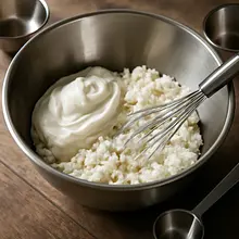 W dużej misce połącz 500 g jogurtu greckiego i 250 g twarogu półtłustego. Użyj rózgi lub miksera na najniższych obrotach i miksuj 30–60 sekund aż do uzyskania gładkiej, jednorodnej masy bez grudek. Dodaj 5 g startej skórki z cytryny, 30 ml soku z cytryny, 5 g ekstraktu waniliowego oraz pozostałe 50 g cukru i miksuj dalej przez 20–30 sekund.