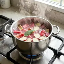 Do średniego garnka wlej 400 ml wody, dodaj pokrojony rabarbar (500 g), plasterki imbiru (40 g) i cukier biały (150 g). Postaw na średnim ogniu i mieszaj drewnianą łyżką, aż cukier się rozpuści. Doprowadź do delikatnego wrzenia, zmniejsz ogień i gotuj 10–12 minut bez przykrywki, mieszając co kilka minut, aż rabarbar zmięknie i puści sok. Kiedy kawałki będą rozpadać się pod naciskiem łyżki, syrop jest gotowy.