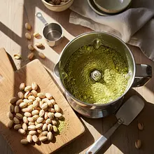 W kielichu blendera o dużej mocy umieść łuskane pistacje i zmiel je na drobną mąkę. Dodaj 25g cukru, 30g mąki pszennej i proszek do pieczenia, a następnie zmiksuj ponownie do połączenia. W osobnej misce roztrzep jajko z 15ml mleka i 15ml oleju. Dodaj mokre składniki do suchych w blenderze i miksuj tylko do uzyskania gładkiej, jednolitej masy o intensywnie zielonym kolorze.