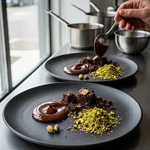 Na koniec udekoruj deser. Za pomocą małej łyżeczki rozrzuć po talerzu perełki kawioru balsamicznego - będą wyglądać jak krople rosy lub leśne jagody. Skrop całość kilkoma kroplami intensywnie zielonego oleju miętowego. Jeśli używasz jadalnych kwiatów, ułóż je delikatnie w kilku miejscach dla dodania koloru i elegancji. Podawaj natychmiast, aby zachować wszystkie kontrasty tekstur.