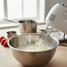 Zmniejsz obroty miksera do minimum. Do lśniącej piany z białek dodawaj po jednym żółtku, miksując tylko do połączenia składników, około 15 sekund po każdym dodanym żółtku. Nie miksuj zbyt długo, aby nie zniszczyć pęcherzyków powietrza w pianie.