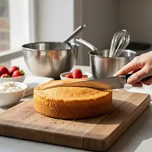 Całkowicie wystudzony biszkopt połóż na desce do krojenia. Użyj długiego, ząbkowanego noża (np. do chleba), aby przekroić go na trzy równe blaty. Aby zrobić to równo, najpierw delikatnie natnij biszkopt dookoła na pożądanej wysokości, a następnie pogłębiaj nacięcie, obracając ciasto, aż przetniesz je na wylot. Powtórz czynność, aby uzyskać trzeci blat.