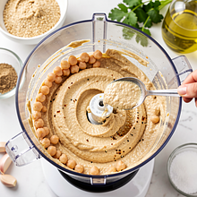 Spróbuj hummus i skoryguj przyprawy: dodaj więcej soku z cytryny, soli lub czosnku według gustu. Jeśli chcesz uzyskać bardzo kremowy hummus, możesz przetrzeć masę przez sito i zebrać gładką część — to opcjonalny zabieg dla super jedwabistej struktury.