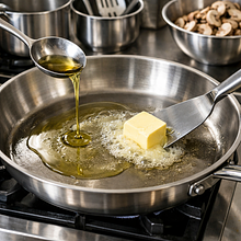 Rozgrzej dużą patelnię na średnim ogniu. Dodaj olej rzepakowy i masło (najpierw olej, potem masło — olej zapobiegnie przypaleniu masła). Gdy masło się rozpuści i zacznie lekko pienić, wrzuć cebulę i smaż 4-5 minut, mieszając drewnianą łyżką, aż cebula stanie się szklista i miękka, ale nie brązowa.