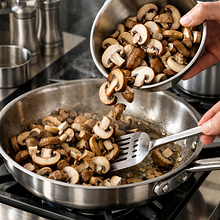 Przygotuj stanowisko pracy: duży garnek na makaron, duża patelnia (najlepiej 26-28 cm) do sosu, deska i ostry nóż. Pieczarki oczyść: nie płucz pod bieżącą wodą, tylko usuń ziemię miękką szczoteczką lub wilgotnym ręcznikiem. Jeśli kapelusz ma brązowe plamy, odetnij miejsca nożem. Pokrój pieczarki w plastry o grubości około 3-4 mm.