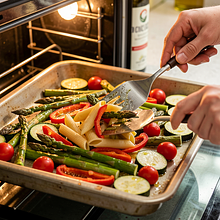 Nagrzej piekarnik do 200°C (góra-dół) lub 180°C z termoobiegiem. Wyłóż blachę papierem do pieczenia. Umyj wszystkie warzywa. Odetnij twarde końce szparagów (zgiń każdy szparag w miejscu, gdzie naturalnie się złamie — twarda część odpadnie) i przekrój dłuższe na pół. Cukinię przekrój wzdłuż na pół, potem w plastry grubości około 1 cm. Paprykę oczyść z nasion i pokrój w paski szerokości 1 cm. Pomidorki zostaw w całości lub przekrój na pół.