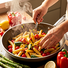 Delikatny makaron penne z chrupiącymi, sezonowymi warzywami pieczonymi w aromatycznym oleju rzepakowym i soku z cytryny. Danie łączy świeże szparagi, cukinię, paprykę i pomidorki koktajlowe, które po upieczeniu nabierają słodyczy i lekkości; całość doprawiona czosnkiem, oregano i świeżą bazylią (opcjonalnie) oraz posypana startym serem żółtym (opcjonalnie). To szybkie, kolorowe i sycące danie główne idealne na wiosenny obiad lub kolację, łatwe do przygotowania nawet dla początkującego kucharza — krok po kroku opisane są przygotowanie warzyw, pieczenie, gotowanie makaronu i finalne łączenie składników.