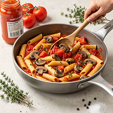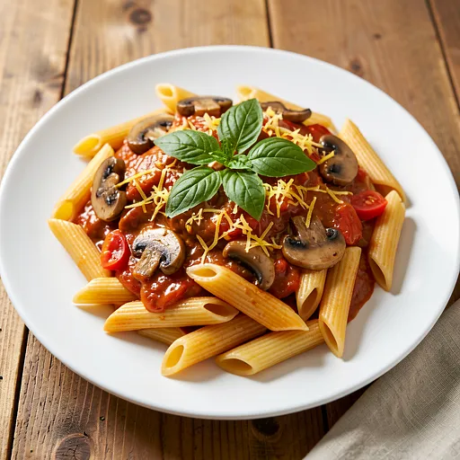 Kremowy makaron penne z domowym sosem pomidorowym i podsmażanymi pieczarkami to nowoczesna, polska wariacja klasycznego dania comfort food. Sos łączy słodycz pomidorów z delikatnym umami pieczarek i łagodną kremowością śmietany, a aromat tymianku nadaje całości przyjemnie ziołowy charakter. Danie jest sycące, estetyczne (czerwono-brązowe nuty sosu i pieczarek z zieloną dekoracją bazylii) i świetnie sprawdza się jako szybki obiad dla rodziny lub danie na nieformalne spotkanie z przyjaciółmi. Podawać z tartym serem żółtym lub świeżą bazylią; dobrze komponuje się z lekkim białym winem lub kompotem z rabarbaru dla wiosennego akcentu.