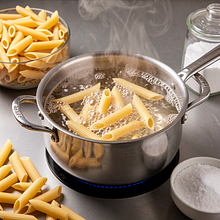 W czasie gdy sos się redukuje, zagotuj duży rondel wody (ok. 3-4 l). Gdy woda wrze, dodaj 10 g soli (ok. 1 łyżeczka) do każdego litra wody — dla 3 l będzie to 30 g; możesz dodać 10 g teraz i resztę później. Wrzuć makaron penne i gotuj zgodnie z instrukcją na opakowaniu minus 1 minutę (zwykle 9-11 minut) — celuj w 'al dente'.