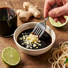 Przygotuj sos w małej misce: wlej sos sojowy (60 ml), dodaj starty lub drobno posiekany imbir (15 g), dociśnij sok z połowy limonki (ok. 20 g) i dokładnie wymieszaj widelcem. Spróbuj – sos powinien być słono-kwaśny z lekką pikantnością imbiru. Jeśli zbyt słony, dodaj 1 łyżkę wody.