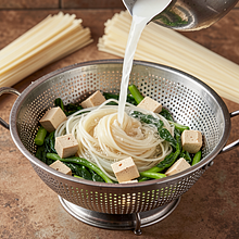 Zagotuj duży garnek wody. Wyłącz ogień i zalej makaron ryżowy (200 g) wrzącą wodą tak, aby był całkowicie przykryty. Pozostaw zgodnie z instrukcją na opakowaniu zwykle 5–8 minut, mieszając co 2 minuty, aby nie sklejał się. Makaron powinien być miękki ale sprężysty („al dente”). Odcedź na durszlaku i przepłucz zimną wodą, aby zatrzymać proces gotowania i zapobiec sklejaniu.