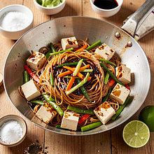 Aromatyczne, lekkie danie inspirowane kuchnią azjatycką, dostosowane do polskiej wiosny: chrupkie szparagi i młoda marchew łączą się z delikatnym tofu i makaronem ryżowym. Sos na bazie sosu sojowego, świeżego imbiru i soku z limonki dodaje kwasowości i świeżości. To szybki, kolorowy obiad lub kolacja, świetny na dni gdy chcemy zjeść warzywnie i sycąco. Podawaj z prażonym sezamem i opcjonalnym sosem chili dla ostrości; dobrze komponuje się z sałatką z młodej kapusty lub kiszonką. Wizualnie danie przyciąga zielenią szparagów, pomarańczem marchwi i czerwienią papryki.