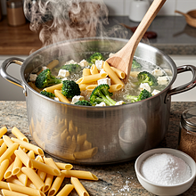 Do dużego garnka wlej około 3 litrów wody i postaw na dużym ogniu. Gdy woda zacznie wrzeć, dodaj 5 g soli (1 łyżeczka). Wrzuć makaron penne i gotuj, mieszając co 1–2 minuty, zgodnie z czasem na opakowaniu minus 1 minutę, aby był al dente (zwykle 8–10 minut). Na 2 minuty przed końcem gotowania makaronu zachowaj 150 ml wody z gotowania, przelewając ją chochlą do osobnego naczynia. Odcedź makaron w durszlaku i nie przelewaj zimną wodą.