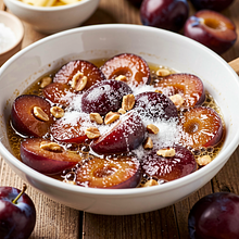 Podawaj danie od razu — lekko ciepłe. Na talerzu śliwki będą błyszczeć, a orzechy pozostaną chrupiące. Jeśli chcesz, dodaj łyżeczkę miodu na każdy talerz jako opcję słodszą.