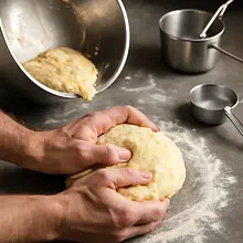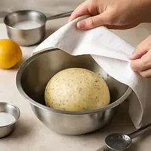 Wyjmij masło i jajka z lodówki co najmniej 30 minut wcześniej, aby osiągnęły temperaturę pokojową. Zmierz wszystkie składniki i postaw je przy stanowisku pracy. Podgrzej 80 ml mleka (z 320 ml) w małym garnuszku do temperatury około 35-38°C — powinna być wyczuwalna jako ciepła na wewnętrznym nadgarstku, nie gorąca. Do małej miseczki pokrusz 25 g świeżych drożdży, dodaj 1 łyżeczkę (ok. 5 g) cukru (z 180 g) i wlej 80 ml ciepłego mleka. Wymieszaj widelcem do rozpuszczenia i odstaw na 8-10 minut; na powierzchni powinna pojawić się piana - to znak aktywności drożdży.
