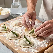 Przesiej mąkę pszenna do dużej miski. Zrób w środku małe wgłębienie. Dodaj sól wokół krawędzi miski. W osobnym naczyniu roztrzep jajko widelcem i podgrzej wodę do temperatury przyjemnie ciepłej (35-40°C). Wlej do wgłębienia jajko, dodaj połowę roztopionego masła i zacznij mieszać widelcem najpierw środek, łącząc mąkę z płynami, aż powstanie gęsta papka.