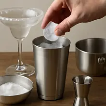 Wybierz 4 kieliszki do koktajli (glass coupe lub kieliszki do martini). Na małym płaskim talerzu rozłóż równomiernie sól (około 8 g na wszystkie kieliszki). Weź limonkę (jeśli używasz) i przekrój na ćwiartki. Przed przygotowaniem koktajlu przecieraj krawędź każdego kieliszka jedną ćwiartką limonki: przyłóż miąższ do brzegu i pokręć, by zwilżyć rant. Natychmiast zanurz zwilżony brzeg w soli, delikatnie obracając kieliszek na talerzu tak, aby sól równomiernie przylepiła do wilgotnego brzegu. Odstaw kieliszki na bok do lekkiego wyschnięcia (1-2 minuty).