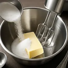 W dużej misce umieść miękkie masło (200 g) i biały cukier (150 g). Użyj miksera elektrycznego z końcówką do ubijania lub ręcznego miksera i ucieraj masę przez 3-4 minuty na średnich obrotach, aż masa zrobi się jasna i puszysta — sprawdź: masa powinna zwiększyć objętość i być gładka, a kryształki cukru lekko rozpuszczone.
