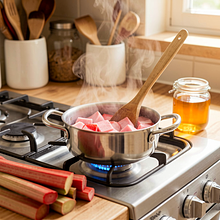 Włóż pokrojony rabarbar do małego garnka, dodaj 20 ml wody (2 łyżki) i 10 g miodu (jeśli używasz; alternatywnie 10 g cukru). Podgrzewaj na średnim ogniu 2–3 minuty mieszając drewnianą łyżką, aż rabarbar puści sok i lekko zmięknie, ale nie rozpadnie się całkowicie. Zdejmij z ognia i odstaw na 1–2 minuty, aby trochę przestygł — musi być ciepły lub letni, NIE gorący.