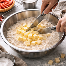 Dodaj zimne, pokrojone w kostkę masło do suchych składników. Użyj noża lub dwóch ostrych szpatułek i siekaj masło w mące, aż masa będzie przypominać grubą bułkę tartą (część grudek masła wielkości groszku jest ok). To działanie trwa około 3-5 minut.